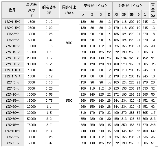 YZS系列振动电机是动力源与振动源结合为一体的激振源,振动电机是在转子轴两端各安装一组可调偏心块,利用轴及偏心块高速旋转产生的离心力得到激振力。振动电机的激振力利用率高、能耗小、寿命长、振动电机的激振力可以无*调节,使用方便,JZO/YZU/YZD/YZS等型号的振动电机为通用型振动电机。振动电机可以应用于一般振动机械,如:振动破碎机、振动筛分机、振动打包机、振动落砂机、振动造型机、振动打桩机、振动提升机、振动充填机、料仓的振动破拱闭塞装置等等。广泛的应用在水电建设、火力发电、建筑、建材、化工、采矿、煤炭、冶金、轻工等工业部门。    YZS型产品组成1、 激振力与出力配合适当,机体质量轻、体积小。2、 因利用平稳的回转产生振动,噪声低。3、全封闭结构,可在任何无防爆要求的粉尘条件下工作。4、设计合理,使用寿命长。5、只需调节两端外侧的偏心块,使之于内侧偏心块形成一定的夹角,就可以无*调整激振力。6、可多机组合成各种振动形式,以完成各种作业要求。7、机种丰富,规格齐全,能满足各类振动机械的工作需要。1、常用电压为380V,如需其他类型电压请注明。2、设备基础采用地脚螺栓固定结构;